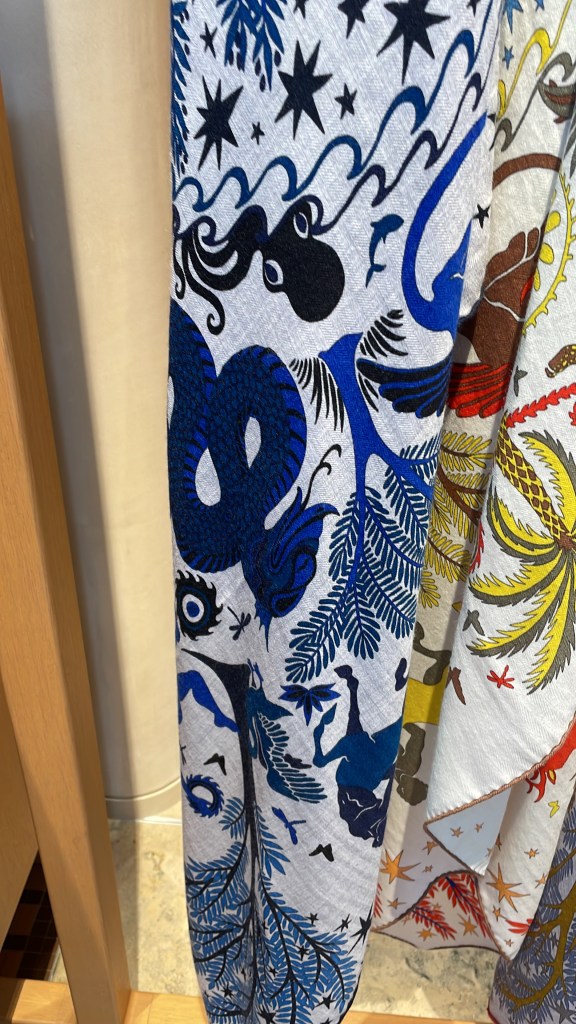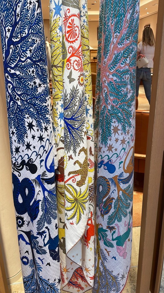 Im Hintergrund meines obigen WOW-Fotos sind einige Kaschmir-Tücher zu sehen, die ich euch nicht vorenthalten möchte, obwohl sie meinem persönlichen Geschmacksempfinden nicht entsprechen. Sie wirken, gemessen an der Brillianz der bisherigen Kaschmirtücher schon fast fade. Da ich jedoch farblich keine zurückhaltende Frau bin, ist es gut, dass die Maison Hermès auch sanftere Töne anbietet. Da habe ich gerade noch mal die Kurve gekriegt *lach*