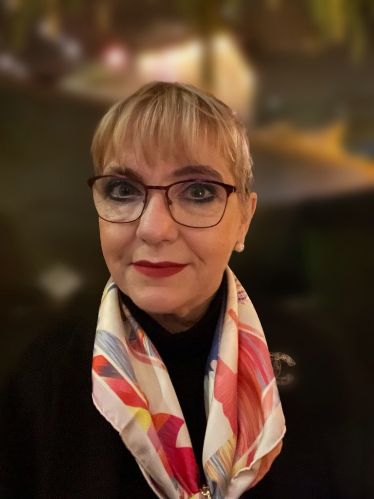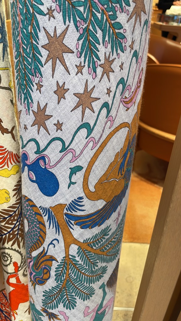 Im August, als ich bei Hermès eine Birkin-Bag bestellen DURFTE, sah ich das WOW-Tuch. Genau meine Farben. Sagte mein Liebster: Du hattest doch vor drei Tagen Geburtstag. Es steht dir SO gut; nimm es mit.