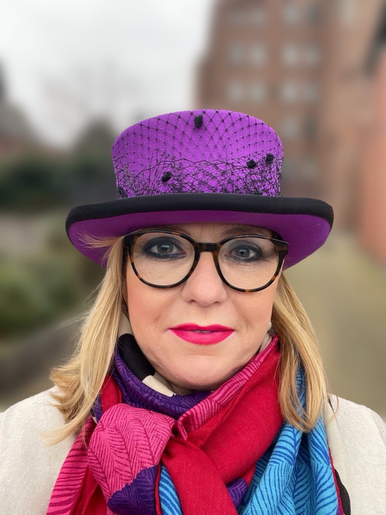 Zu einem winterlichen Kleid kommen der Hut von Susanne Arnken, die kleine Capucines BB in „Tangerine“ und der traumhafte Kaschmirschal, Modell „Stola New Libris“, Abmessung ca. 75 x 213 cm, gut zur Geltung. Wie so oft trage ich Ohrringe von Aleksandra Stanic Jewellery